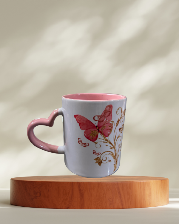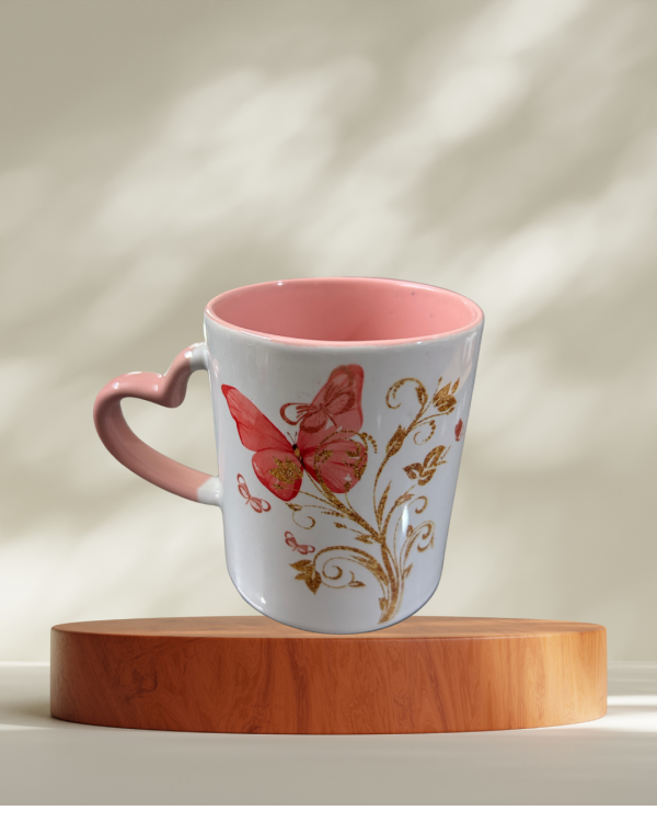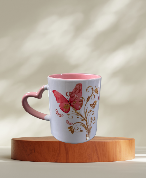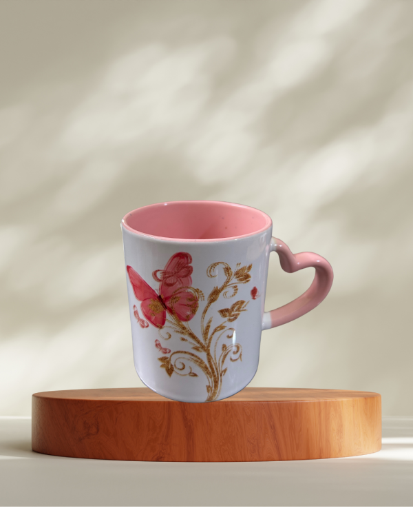 Sip in style with our premium-quality heart-handled mug, which is beautifully designed for those who appreciate charm and craftsmanship. This elegant pink mug features a graceful butterfly and flower print, capturing the beauty of nature in every detail.